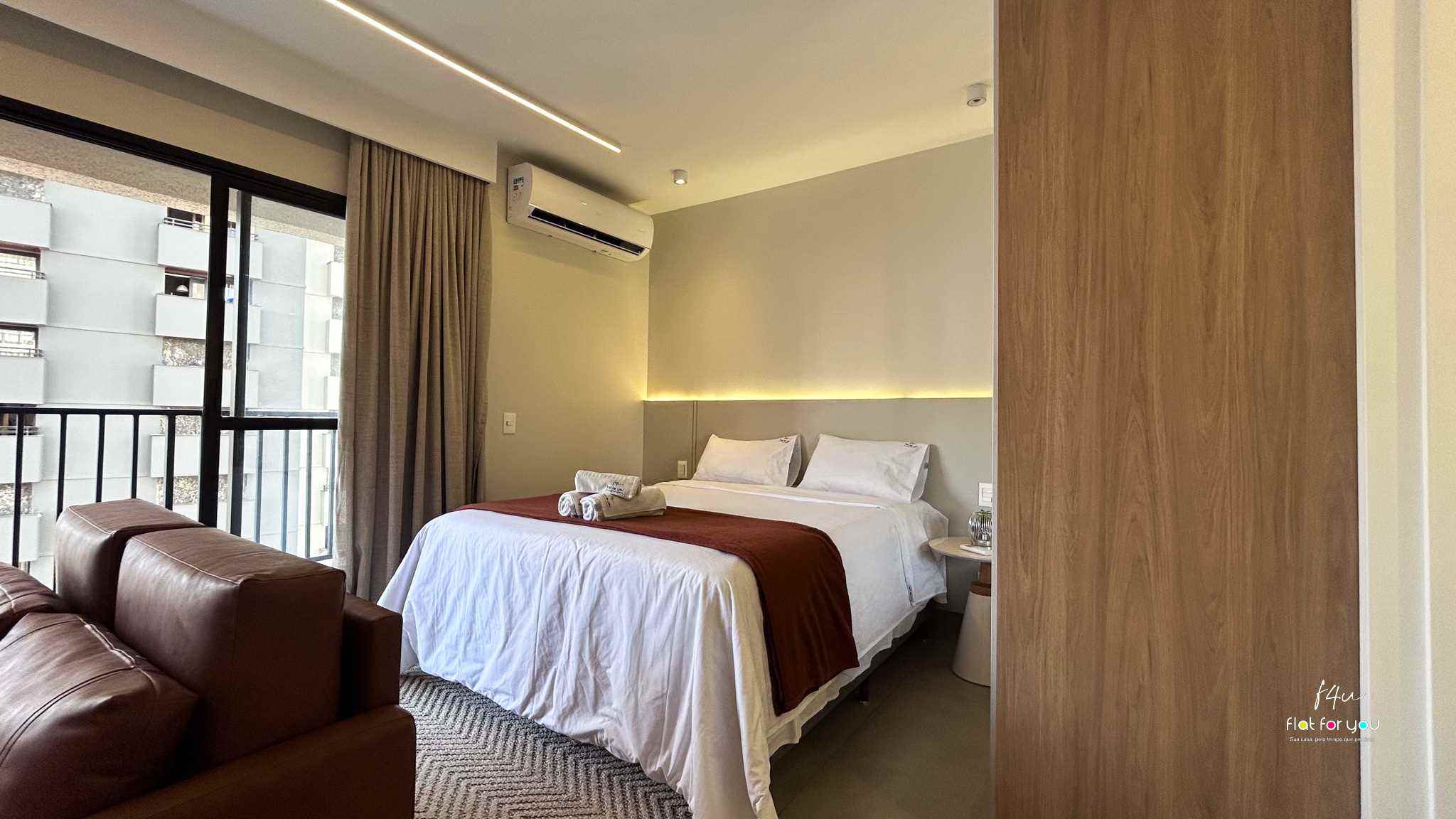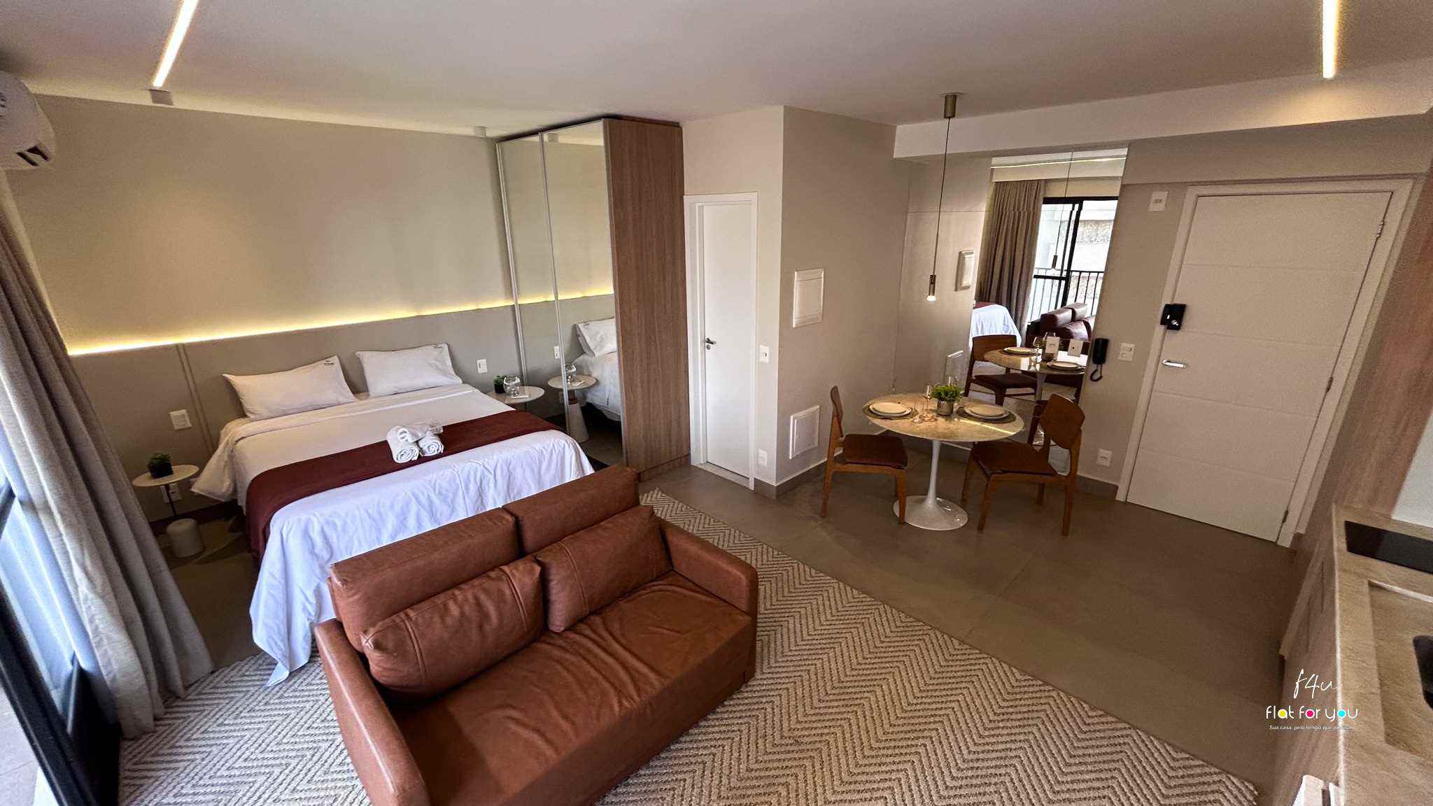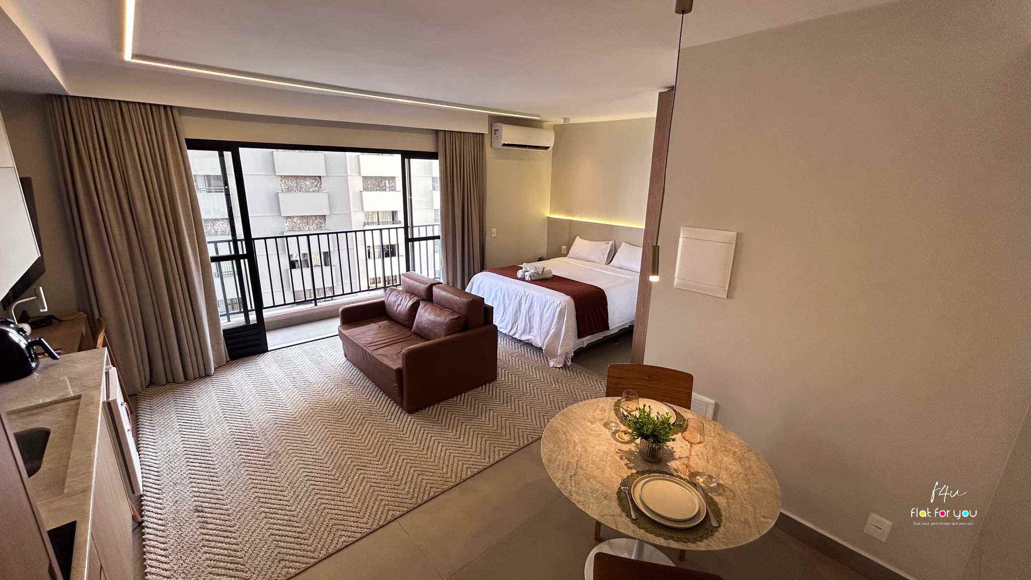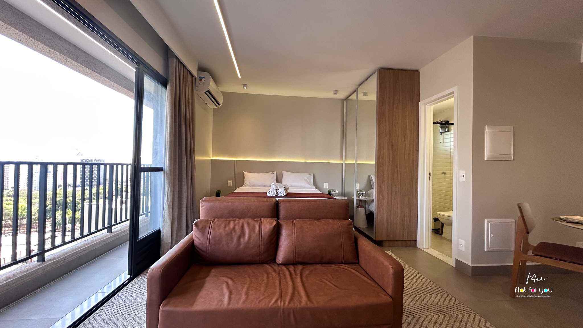 O quarto confortável, equipado com TV, proporciona momentos de descanso e tranquilidade após um dia cheio. A sala, decorada com um sofá-cama elegante, é versátil e charmosa.