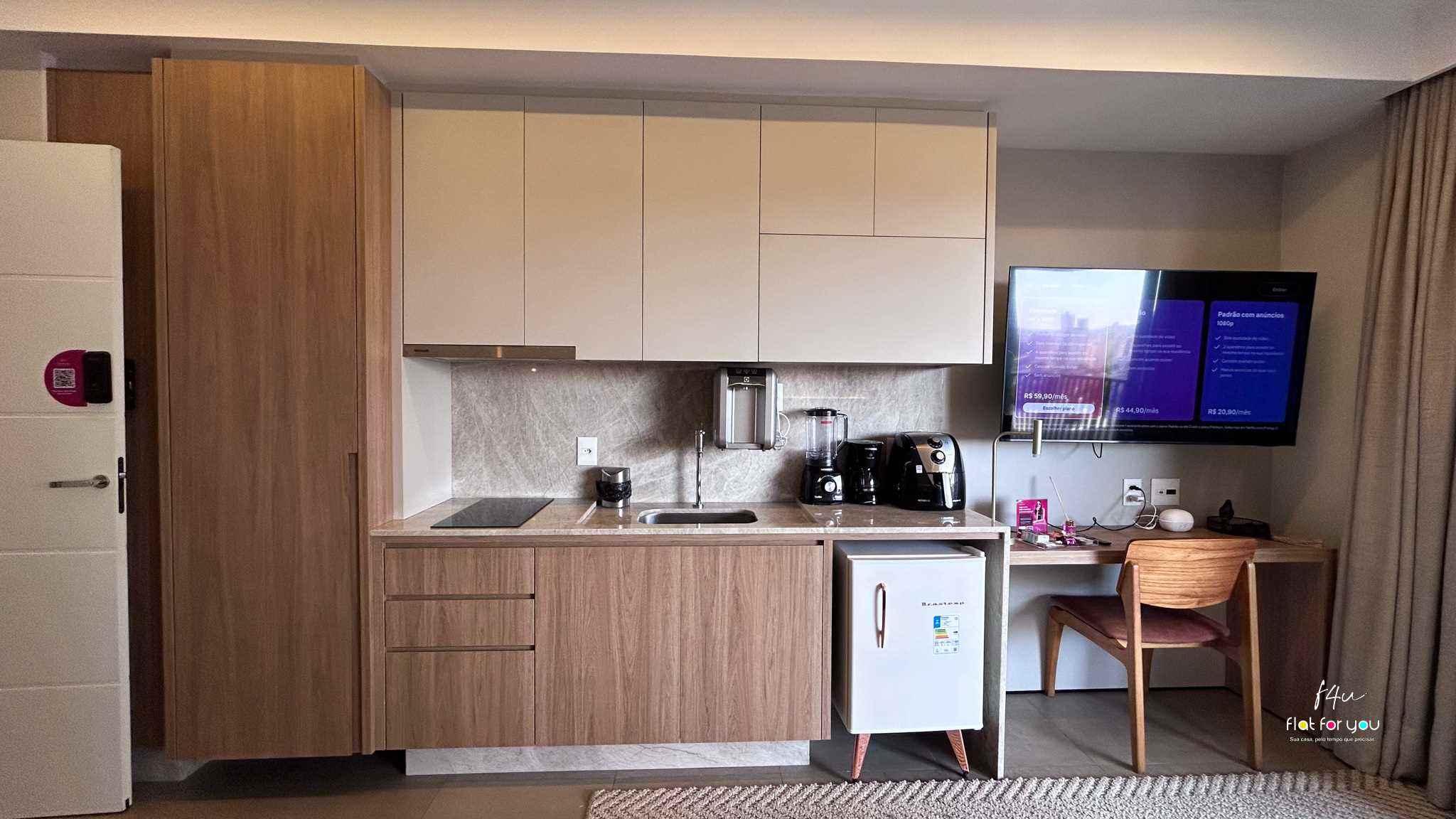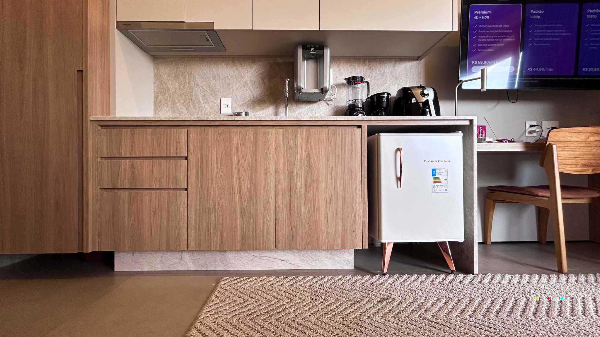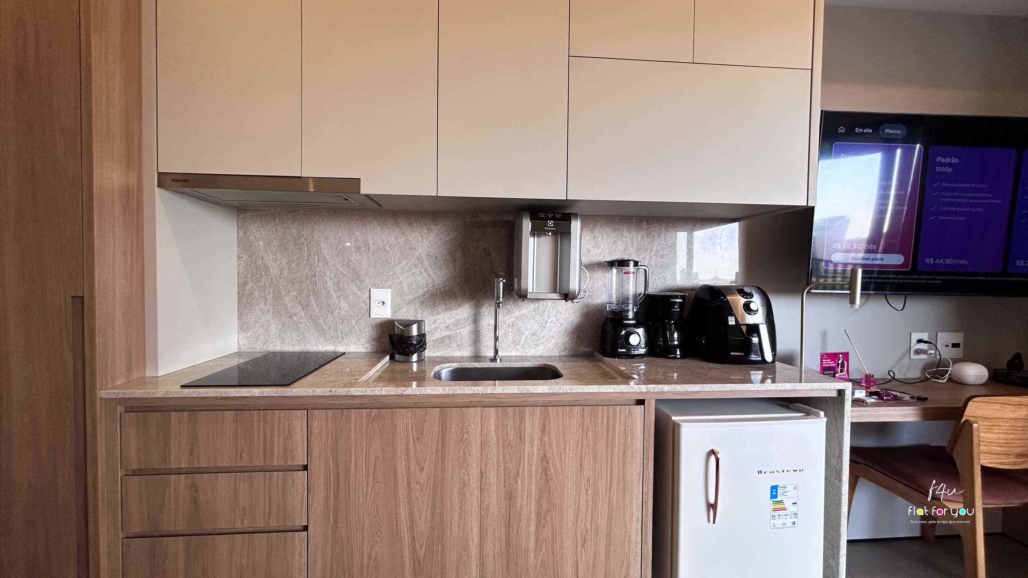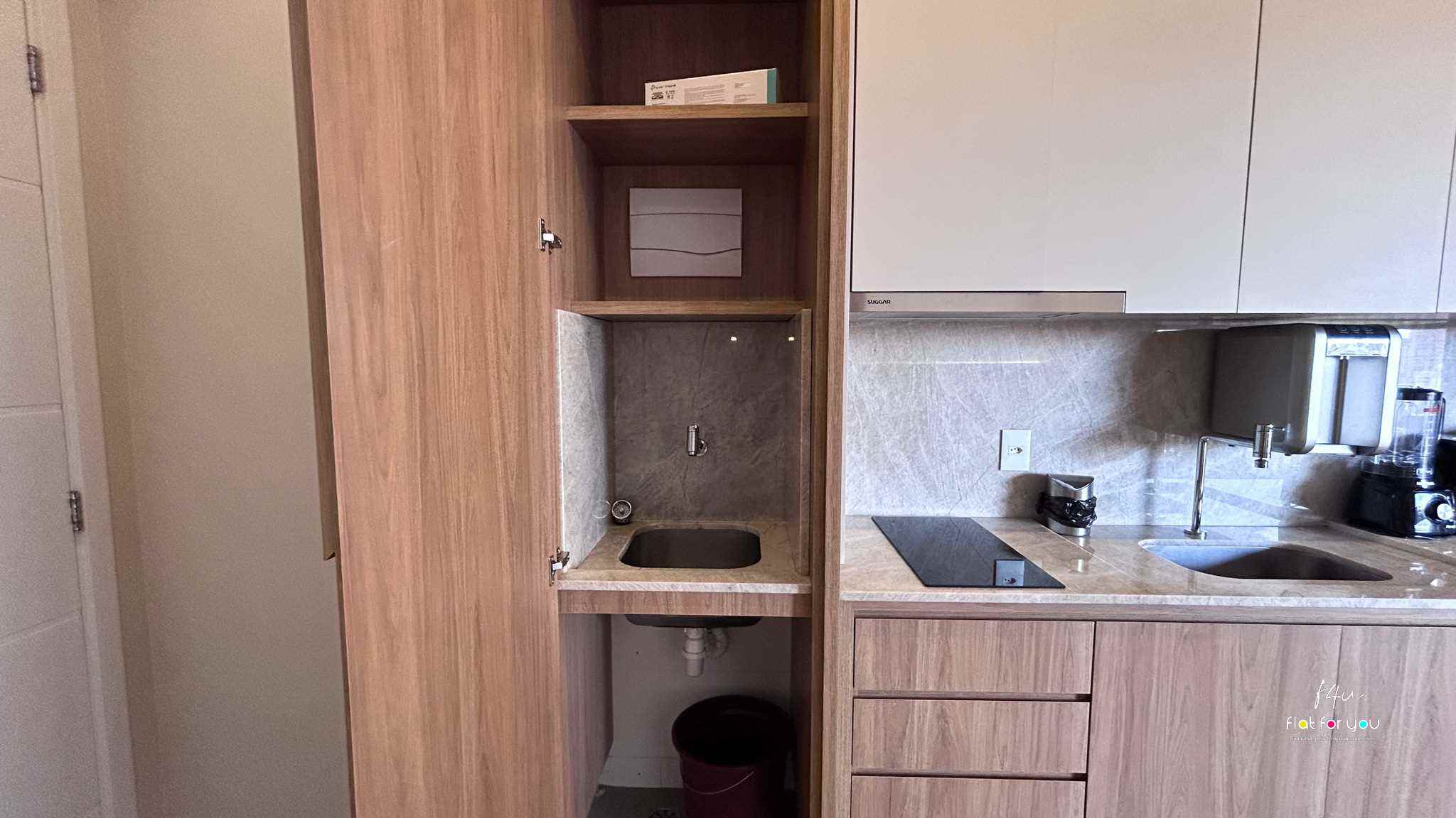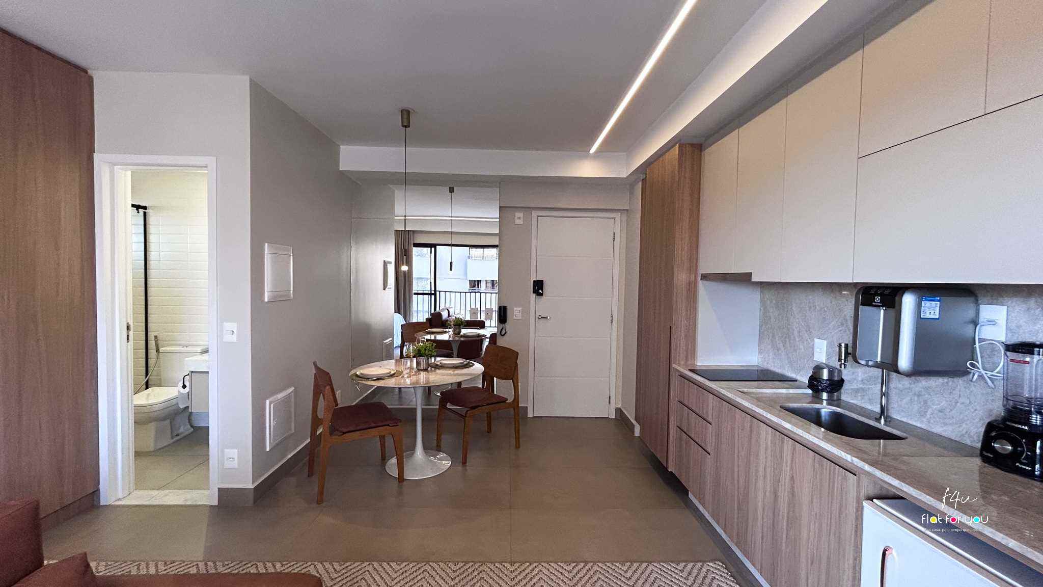A cozinha planejada combina modernidade e funcionalidade, oferecendo praticidade no dia a dia com um toque de sofisticação. O banheiro, com acabamento refinado, traduz conforto e cuidado em cada detalhe.