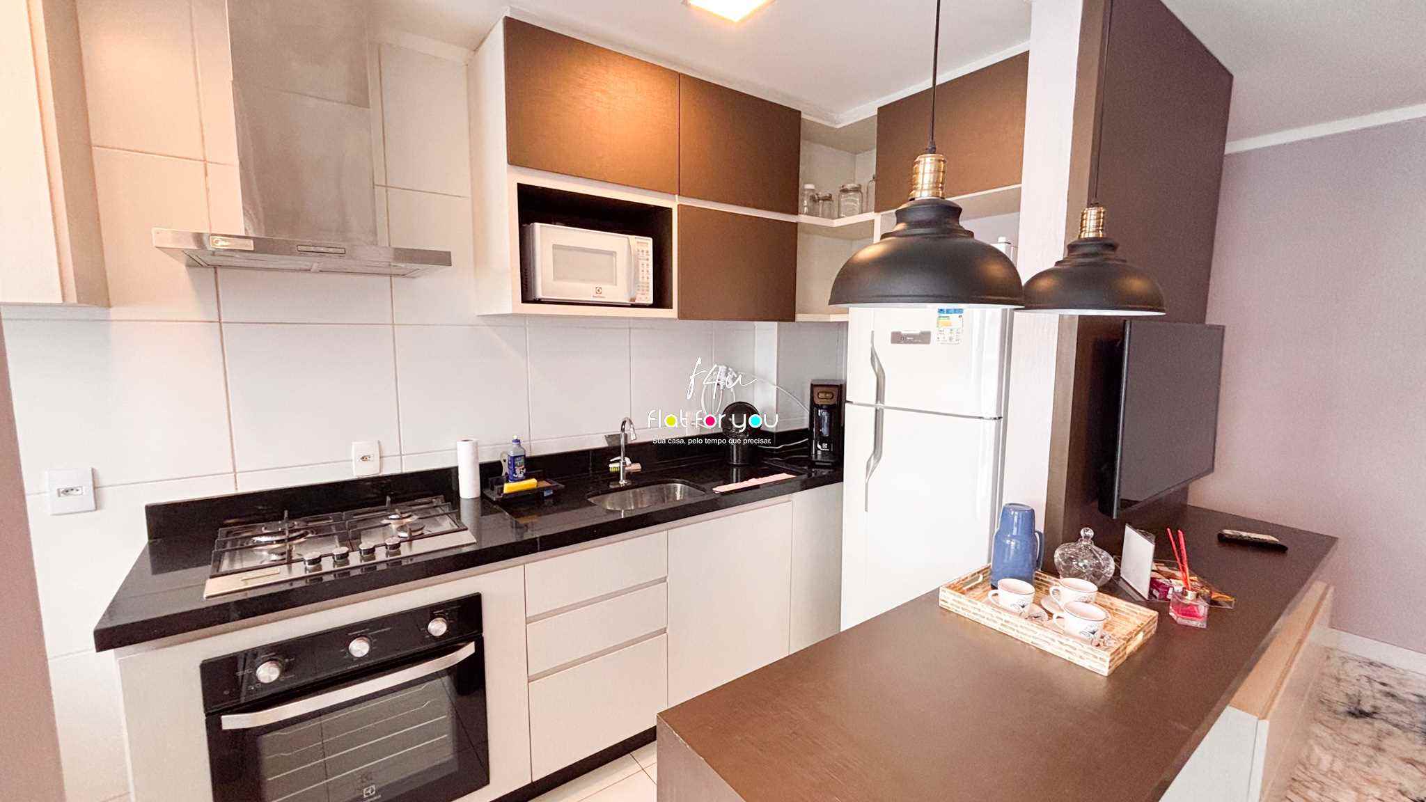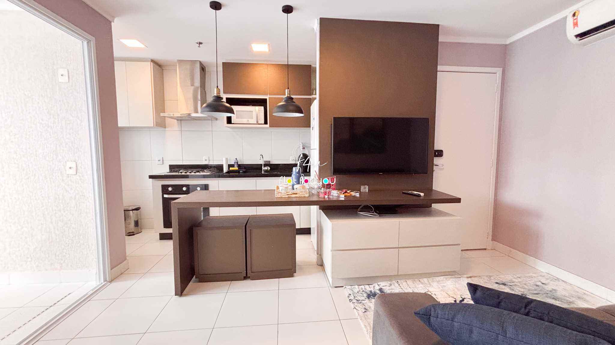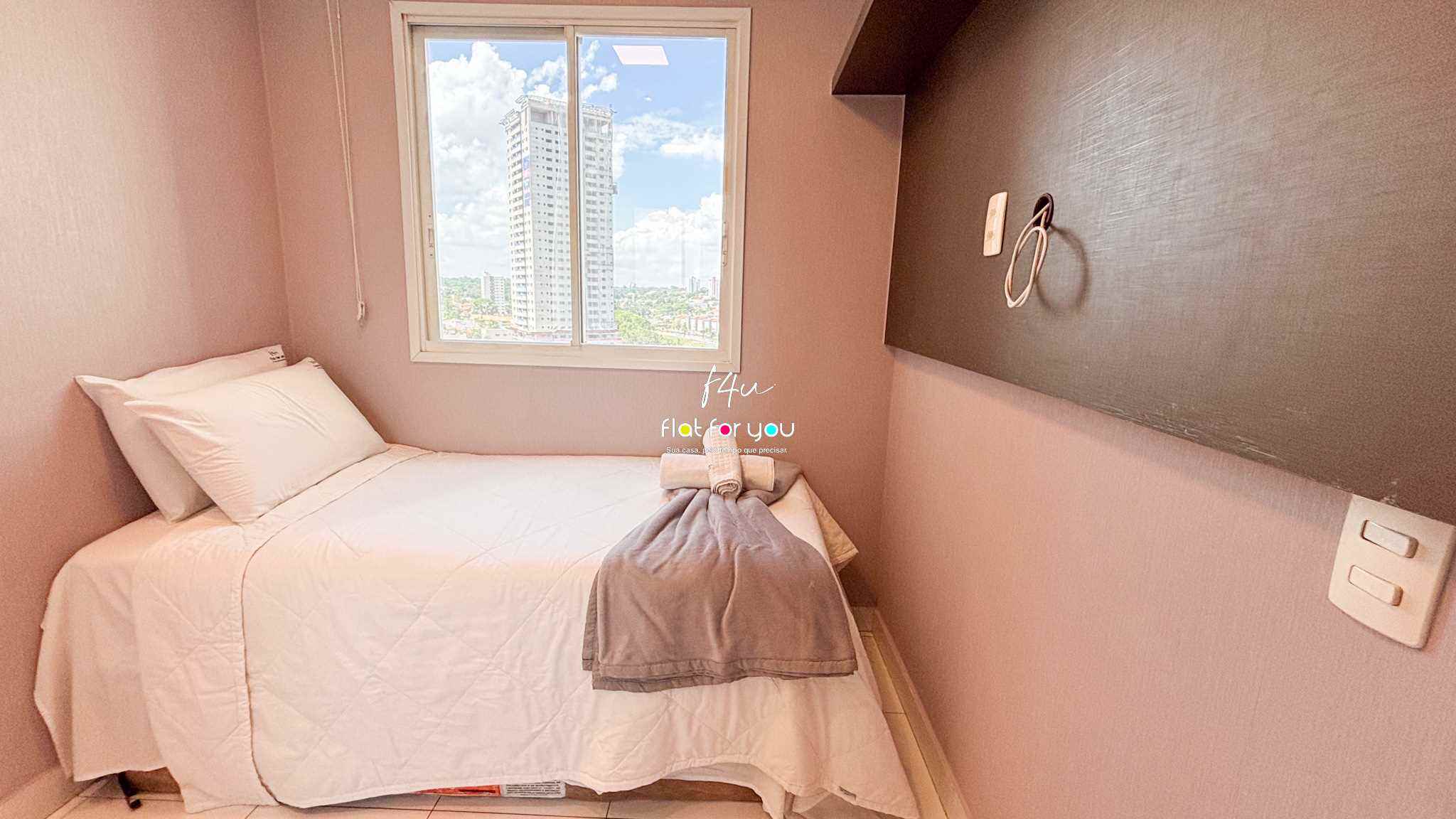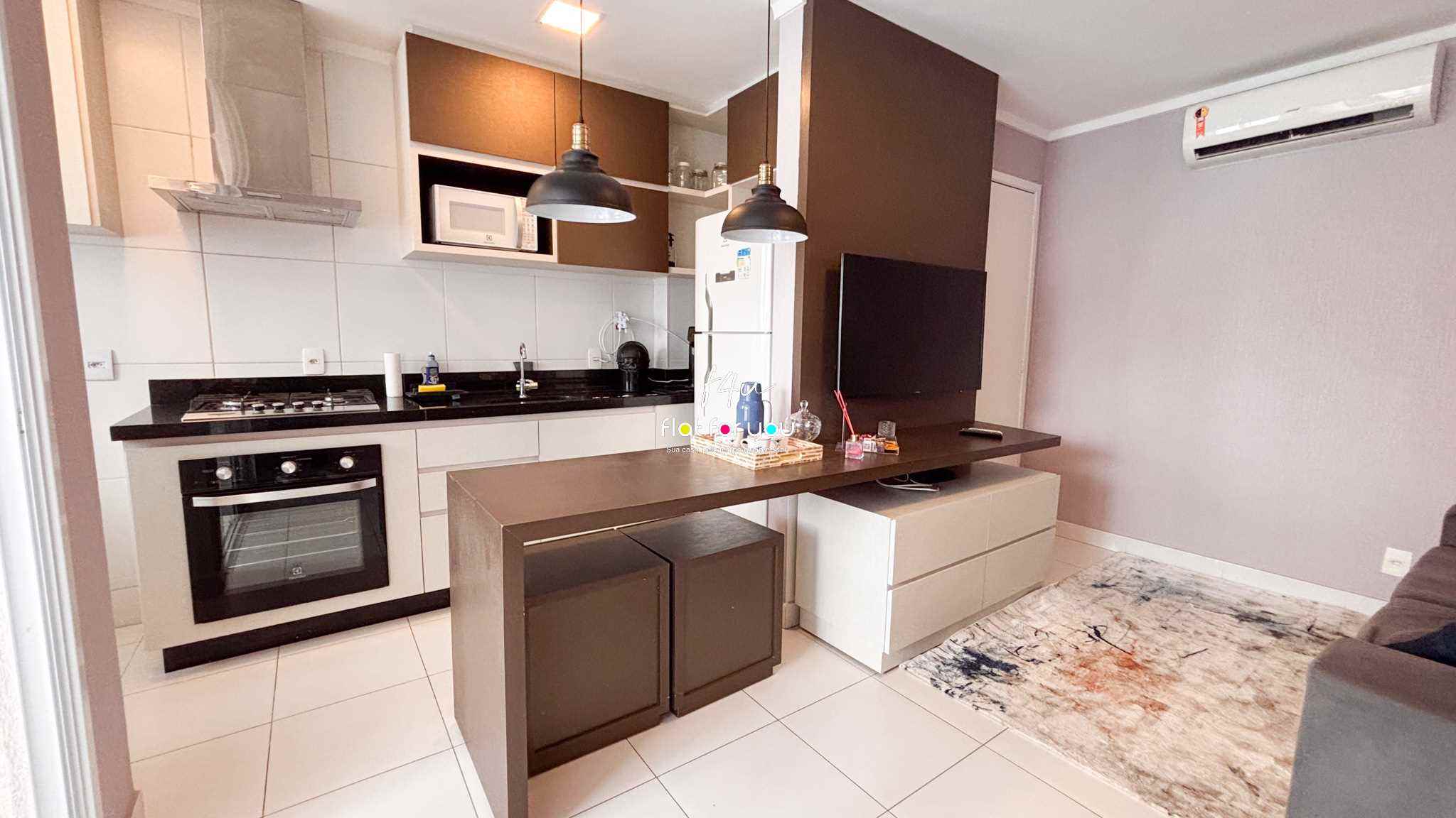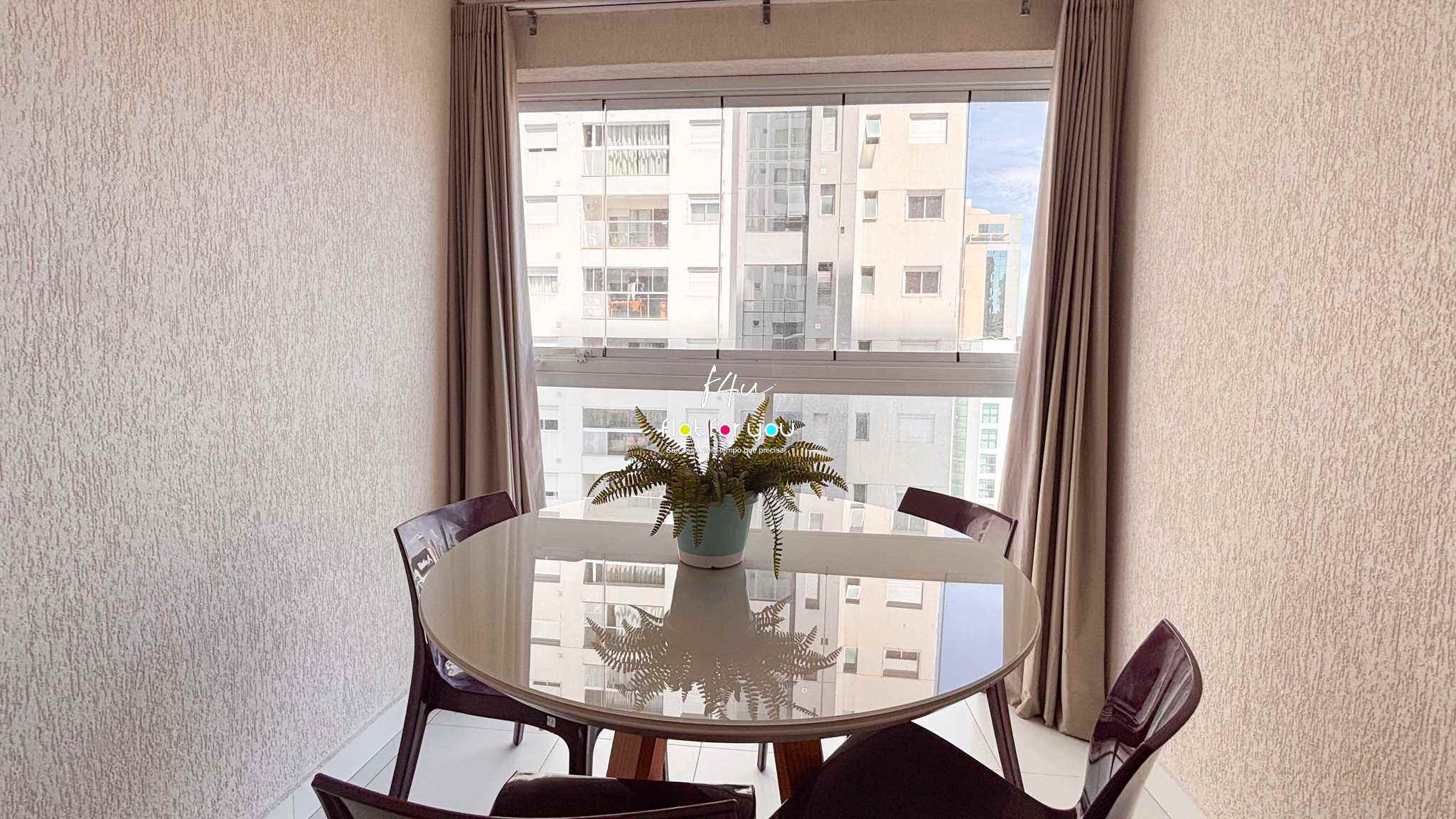 Apartamento de 2 quartos , dispõe de uma sala espaçosa, cozinha e área de serviço. Está 100% mobiliado e decorado com bom gosto e esmero. Possui cortinas em todas as janelas, armários planejados em todos os ambientes, ar condicionado nos quartos e na sala.